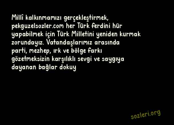 Millî kalkınmamızı gerçekleştirmek, her Türk ferdini hür yapabilmek için Türk Milletini yeniden kurmak zorundayız. Vatandaşlarımız arasında parti, mezhep, ırk ve bölge farkı gözetmeksizin karşılıklı sevgi ve saygıya dayanan bağlar dokuy ( Türkçü Sözler )