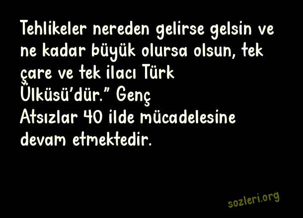 Tehlikeler nereden gelirse gelsin ve ne kadar büyük olursa olsun, tek çare ve tek ilacı Türk Ülküsü’dür.” Genç Atsızlar 40 ilde mücadelesine devam etmektedir. ( Türkçü Sözler )