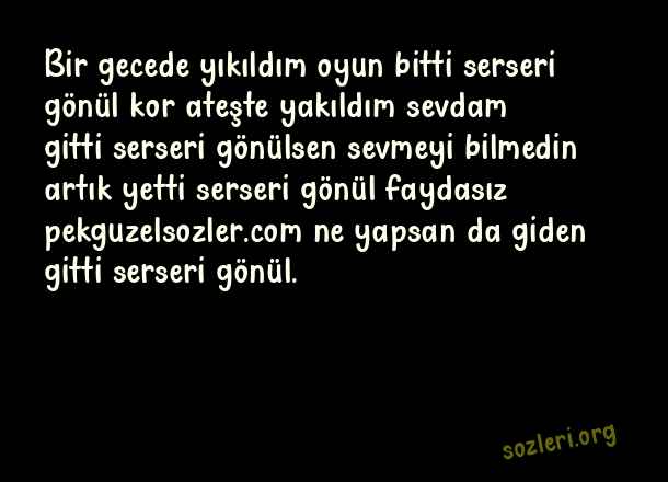 Bir gecede yıkıldım oyun bitti serseri gönül kor ateşte yakıldım sevdam gitti serseri gönülsen sevmeyi bilmedin artık yetti serseri gönül faydasız ne yapsan da giden gitti serseri gönül. ( Ukala Sözler )