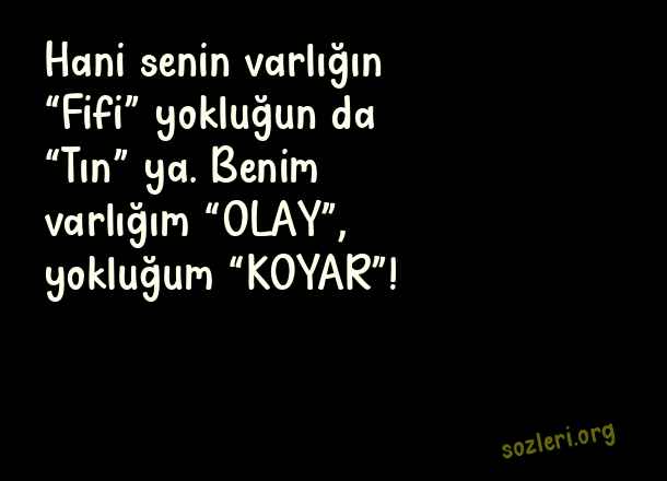 Hani senin varlığın “Fifi” yokluğun da “Tın” ya. Benim varlığım “OLAY”, yokluğum “KOYAR”! ( Ukala Sözler )