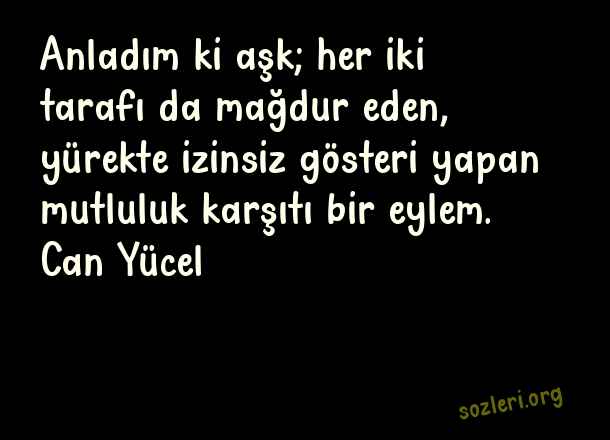 Anladım ki aşk; her iki tarafı da mağdur eden, yürekte izinsiz gösteri yapan mutluluk karşıtı bir eylem. Can Yücel ( Ünlü Aşk )