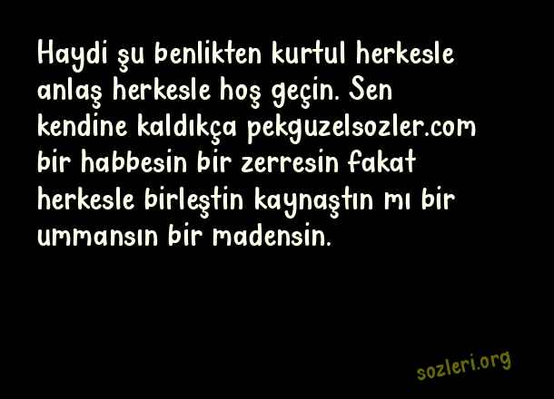 Haydi şu benlikten kurtul herkesle anlaş herkesle hoş geçin. Sen kendine kaldıkça bir habbesin bir zerresin fakat herkesle birleştin kaynaştın mı bir ummansın bir madensin. ( Ünlü Mevlana )