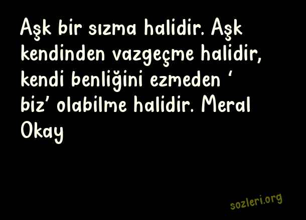 Aşk bir sızma halidir. Aşk kendinden vazgeçme halidir, kendi benliğini ezmeden ‘ biz’ olabilme halidir. Meral Okay ( Ünlü Aşk )