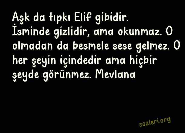 Aşk da tıpkı Elif gibidir. İsminde gizlidir, ama okunmaz. O olmadan da besmele sese gelmez. O her şeyin içindedir ama hiçbir şeyde görünmez. Mevlana ( Ünlü Aşk )