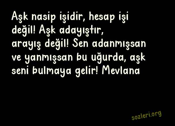 Aşk nasip işidir, hesap işi değil! Aşk adayıştır, arayış değil! Sen adanmışsan ve yanmışsan bu uğurda, aşk seni bulmaya gelir! Mevlana ( Ünlü Aşk )