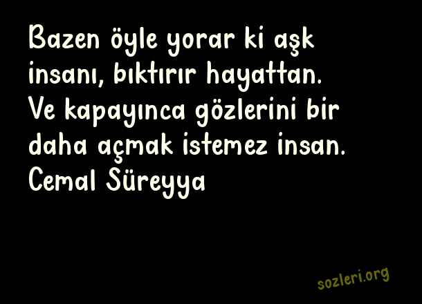 Bazen öyle yorar ki aşk insanı, bıktırır hayattan. Ve kapayınca gözlerini bir daha açmak istemez insan. Cemal Süreyya ( Ünlü Aşk )