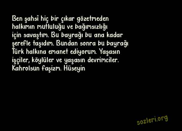Ben şahsî hiç bir çıkar gözetmeden halkımın mutluluğu ve bağımsızlığı için savaştım. Bu bayrağı bu ana kadar şerefle taşıdım. Bundan sonra bu bayrağı Türk halkına emanet ediyorum. Yaşasın işçiler, köylüler ve yaşasın devrimciler. Kahrolsun faşizm. Hüseyin ( Ünlülerin Son )