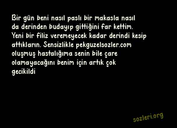 Bir gün beni nasıl paslı bir makasla nasıl da derinden budayıp gittiğini far kettim. Yeni bir filiz veremeyecek kadar derindi kesip attıkların. Sensizlikle oluşmuş hastalığıma senin bile çare olamayacağını benim için artık çok gecikildi ( Hüzünlü Sözler )