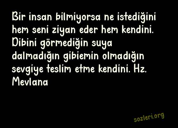Bir insan bilmiyorsa ne istediğini hem seni ziyan eder hem kendini. Dibini görmediğin suya dalmadığın gibiemin olmadığın sevgiye teslim etme kendini. Hz. Mevlana ( Dünyaca Ünlü Sözler )