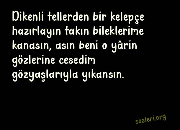 Dikenli tellerden bir kelepçe hazırlayın takın bileklerime kanasın, asın beni o yârin gözlerine cesedim gözyaşlarıyla yıkansın. ( Hüzünlü Sözler )