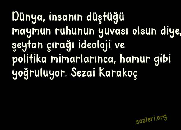 Dünya, insanın düştüğü maymun ruhunun yuvası olsun diye, şeytan çırağı ideoloji ve politika mimarlarınca, hamur gibi yoğruluyor. Sezai Karakoç ( Ünlü Düşünürlerin )