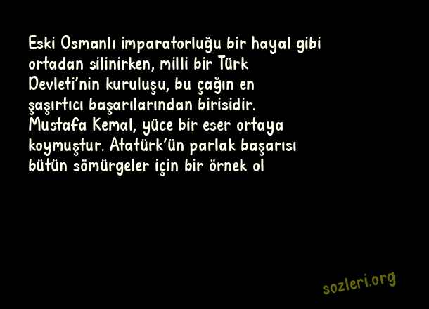 Eski Osmanlı imparatorluğu bir hayal gibi ortadan silinirken, milli bir Türk Devleti’nin kuruluşu, bu çağın en şaşırtıcı başarılarından birisidir. Mustafa Kemal, yüce bir eser ortaya koymuştur. Atatürk’ün parlak başarısı bütün sömürgeler için bir örnek ol ( Ünlülerden 10 Kasım )