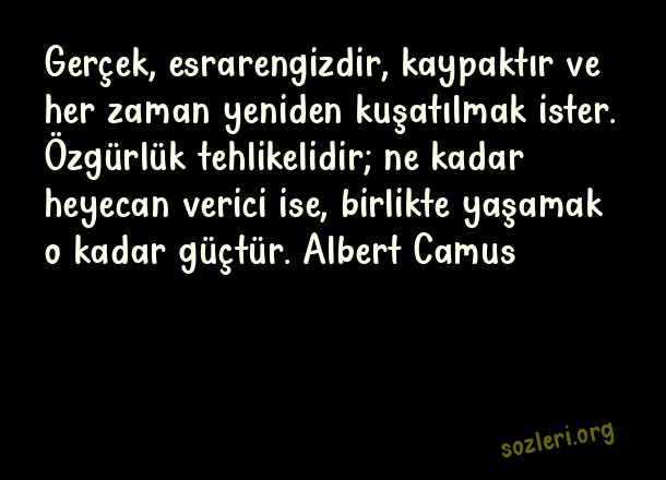 Gerçek, esrarengizdir, kaypaktır ve her zaman yeniden kuşatılmak ister. Özgürlük tehlikelidir; ne kadar heyecan verici ise, birlikte yaşamak o kadar güçtür. Albert Camus ( Ünlü Düşünürlerin )