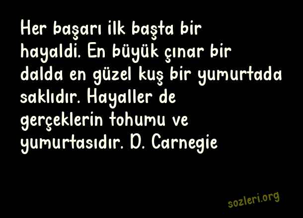 Her başarı ilk başta bir hayaldi. En büyük çınar bir dalda en güzel kuş bir yumurtada saklıdır. Hayaller de gerçeklerin tohumu ve yumurtasıdır. D. Carnegie ( Kısa Ünlü Sözler )