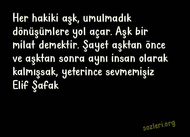 Her hakiki aşk, umulmadık dönüşümlere yol açar. Aşk bir milat demektir. Şayet aşktan önce ve aşktan sonra aynı insan olarak kalmışsak, yeterince sevmemişiz… Elif Şafak ( Ünlü Aşk )