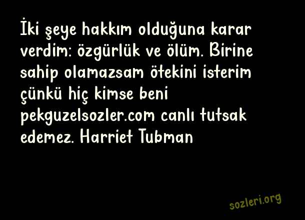 İki şeye hakkım olduğuna karar verdim: özgürlük ve ölüm. Birine sahip olamazsam ötekini isterim çünkü hiç kimse beni canlı tutsak edemez. Harriet Tubman ( Anlamlı Ünlü Sözler )