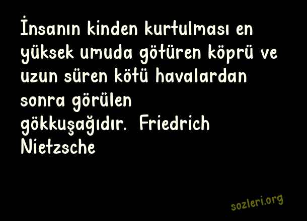 İnsanın kinden kurtulması en yüksek umuda götüren köprü ve uzun süren kötü havalardan sonra görülen gökkuşağıdır. Friedrich Nietzsche ( Ünlü Düşünürlerin )