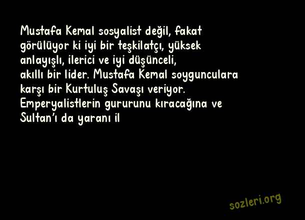 Mustafa Kemal sosyalist değil, fakat görülüyor ki iyi bir teşkilatçı, yüksek anlayışlı, ilerici ve iyi düşünceli, akıllı bir lider. Mustafa Kemal soygunculara karşı bir Kurtuluş Savaşı veriyor. Emperyalistlerin gururunu kıracağına ve Sultan’ı da yaranı il ( Ünlülerden 10 Kasım )