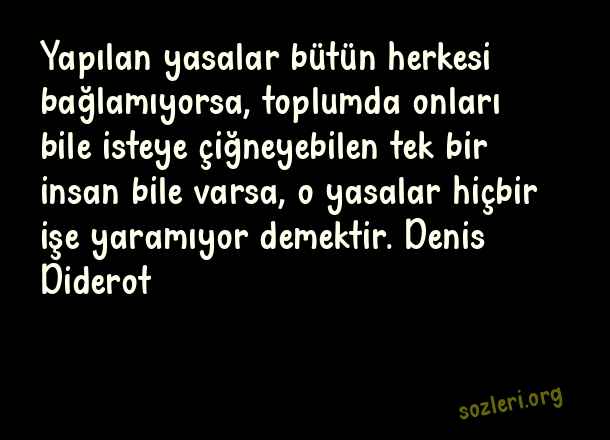 Yapılan yasalar bütün herkesi bağlamıyorsa, toplumda onları bile isteye çiğneyebilen tek bir insan bile varsa, o yasalar hiçbir işe yaramıyor demektir. Denis Diderot ( Ünlü Düşünürlerin )