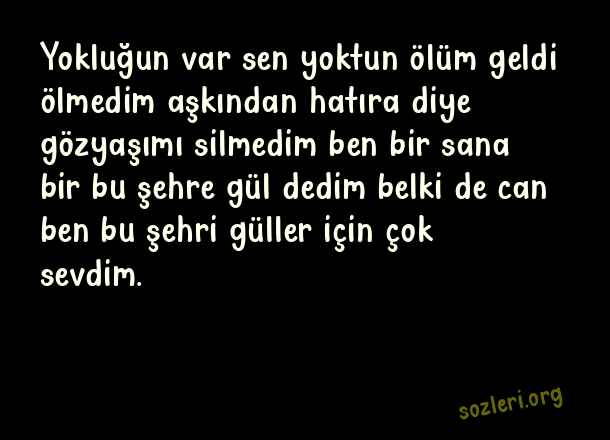 Yokluğun var sen yoktun ölüm geldi ölmedim aşkından hatıra diye gözyaşımı silmedim ben bir sana bir bu şehre gül dedim belki de can ben bu şehri güller için çok sevdim. ( Hüzünlü Sözler )