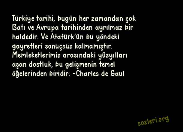 Türkiye tarihi, bugün her zamandan çok Batı ve Avrupa tarihinden ayrılmaz bir haldedir. Ve Atatürk’ün bu yöndeki gayretleri sonuçsuz kalmamıştır. Memleketlerimiz arasındaki yüzyılları aşan dostluk, bu gelişmenin temel öğelerinden biridir. -Charles de Gaul ( Ünlülerden 10 Kasım )