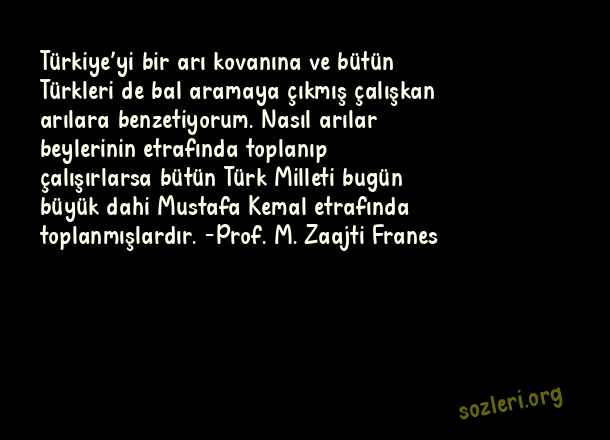 Türkiye’yi bir arı kovanına ve bütün Türkleri de bal aramaya çıkmış çalışkan arılara benzetiyorum. Nasıl arılar beylerinin etrafında toplanıp çalışırlarsa bütün Türk Milleti bugün büyük dahi Mustafa Kemal etrafında toplanmışlardır. -Prof. M. Zaajti Franes ( Ünlülerden 10 Kasım )
