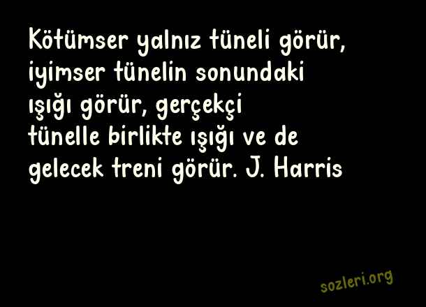 Kötümser yalnız tüneli görür, iyimser tünelin sonundaki ışığı görür, gerçekçi tünelle birlikte ışığı ve de gelecek treni görür. J. Harris ( Ünlülerden Güzel Kısa Sözler )