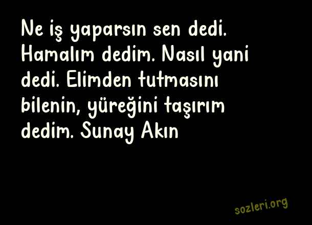 Ne iş yaparsın sen dedi. Hamalım dedim. Nasıl yani dedi. Elimden tutmasını bilenin, yüreğini taşırım dedim. Sunay Akın ( Ünlülerin Güzel )