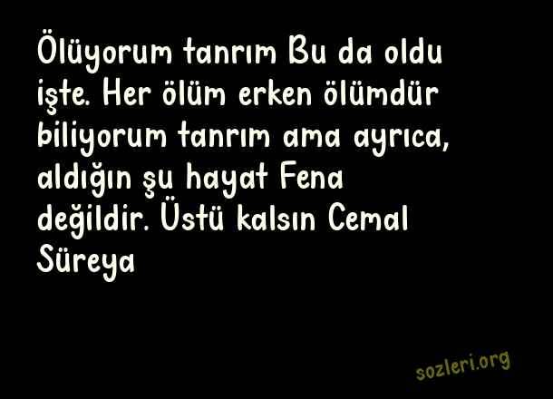 Ölüyorum tanrım Bu da oldu işte. Her ölüm erken ölümdür biliyorum tanrım ama ayrıca, aldığın şu hayat Fena değildir. Üstü kalsın Cemal Süreya ( Ünlülerin Son )