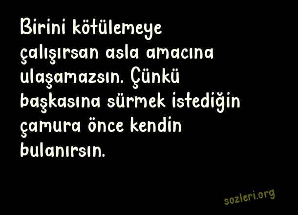 Birini kötülemeye çalışırsan asla amacına ulaşamazsın. Çünkü başkasına sürmek istediğin çamura önce kendin bulanırsın. ( Düzgün Sözler )