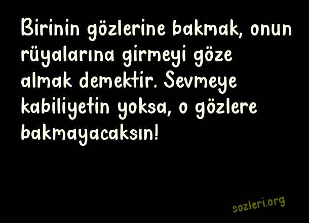 Birinin gözlerine bakmak, onun rüyalarına girmeyi göze almak demektir. Sevmeye kabiliyetin yoksa, o gözlere bakmayacaksın! ( Üzgün Sözler )