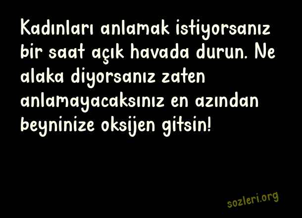Kadınları anlamak istiyorsanız bir saat açık havada durun. Ne alaka diyorsanız zaten anlamayacaksınız en azından beyninize oksijen gitsin! ( Düzgün Sözler )
