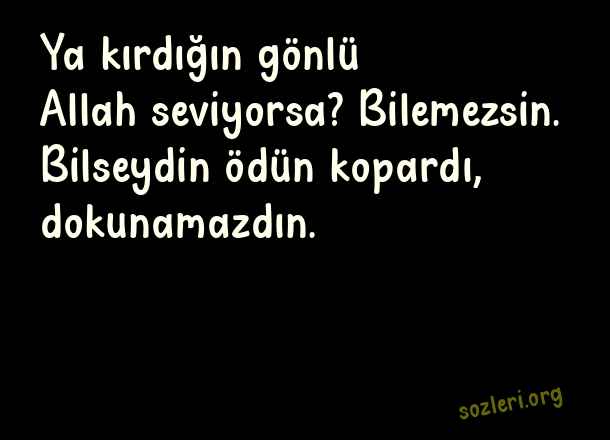 Ya kırdığın gönlü - Üzgün Sözler .. Ya kırdığın gönlü Allah seviyorsa? Bilemezsin. Bilseydin ödün kopardı, dokunamazdın. ( Üzgün Sözler )