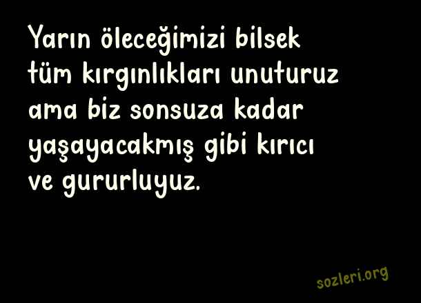 Yarın öleceğimizi bilsek tüm kırgınlıkları unuturuz ama biz sonsuza kadar yaşayacakmış gibi kırıcı ve gururluyuz. ( Düzgün Sözler )