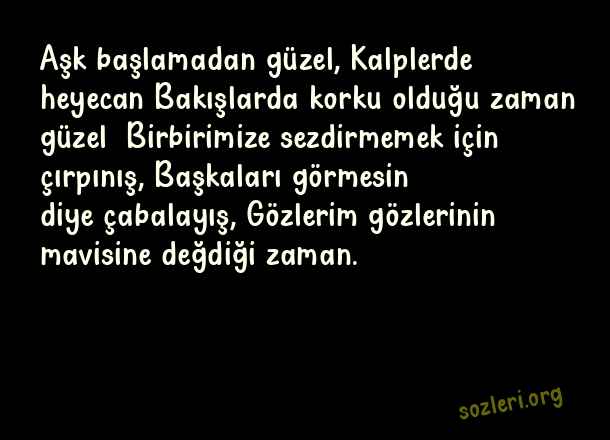 Aşk başlamadan güzel, Kalplerde heyecan Bakışlarda korku olduğu zaman güzel… Birbirimize sezdirmemek için çırpınış, Başkaları görmesin diye çabalayış, Gözlerim gözlerinin mavisine değdiği zaman. ( Uzun Aşk )
