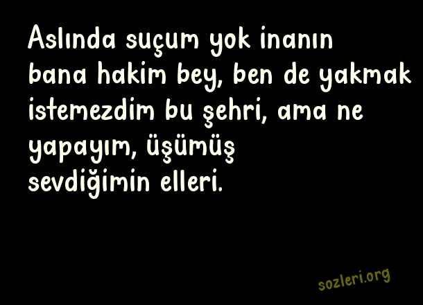 Aslında suçum yok inanın bana hakim bey, ben de yakmak istemezdim bu şehri, ama ne yapayım, üşümüş sevdiğimin elleri. ( Sevgiliye Sevilene En Güzel Kısa Uzun Aşk )