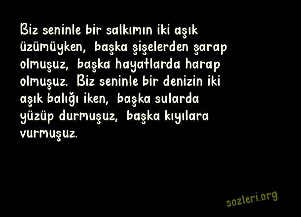 Biz seninle bir salkımın iki aşık üzümüyken, başka şişelerden şarap olmuşuz, başka hayatlarda harap olmuşuz. Biz seninle bir denizin iki aşık balığı iken, başka sularda yüzüp durmuşuz, başka kıyılara vurmuşuz. ( Uzun Aşk )