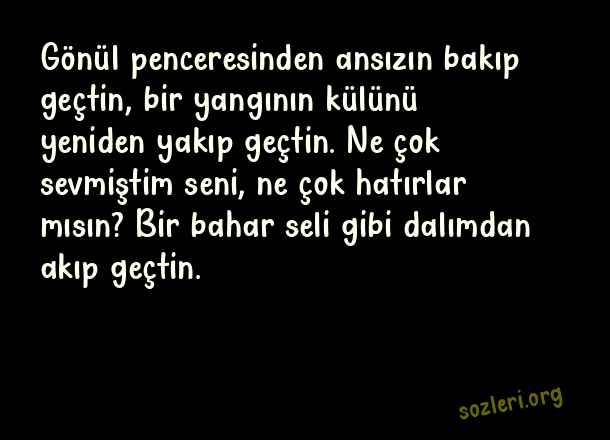 Gönül penceresinden ansızın bakıp geçtin, bir yangının külünü yeniden yakıp geçtin. Ne çok sevmiştim seni, ne çok hatırlar mısın? Bir bahar seli gibi dalımdan akıp geçtin. ( Sevgiliye Sevilene En Güzel Kısa Uzun Aşk )