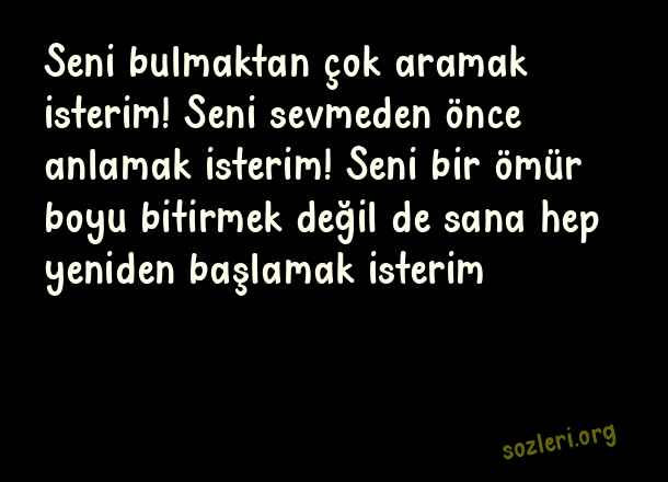 Seni bulmaktan çok aramak isterim! Seni sevmeden önce anlamak isterim! Seni bir ömür boyu bitirmek değil de sana hep yeniden başlamak isterim… ( Uzun Aşk )