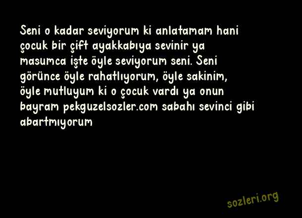 Seni o kadar seviyorum ki anlatamam hani çocuk bir çift ayakkabıya sevinir ya masumca işte öyle seviyorum seni. Seni görünce öyle rahatlıyorum, öyle sakinim, öyle mutluyum ki o çocuk vardı ya onun bayram sabahı sevinci gibi abartmıyorum ( Uzun Aşk )