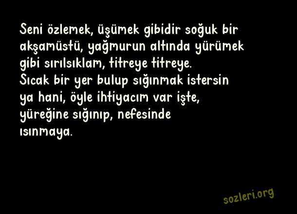 Seni özlemek, üşümek gibidir soğuk bir akşamüstü, yağmurun altında yürümek gibi sırılsıklam, titreye titreye. Sıcak bir yer bulup sığınmak istersin ya hani, öyle ihtiyacım var işte, yüreğine sığınıp, nefesinde ısınmaya. ( Uzun Aşk )