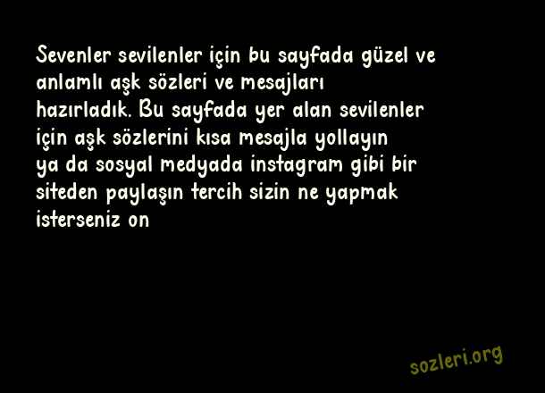 Sevenler sevilenler için bu sayfada güzel ve anlamlı aşk sözleri ve mesajları hazırladık. Bu sayfada yer alan sevilenler için aşk sözlerini kısa mesajla yollayın ya da sosyal medyada instagram gibi bir siteden paylaşın tercih sizin ne yapmak isterseniz on ( Sevgiliye Sevilene En Güzel Kısa Uzun Aşk )
