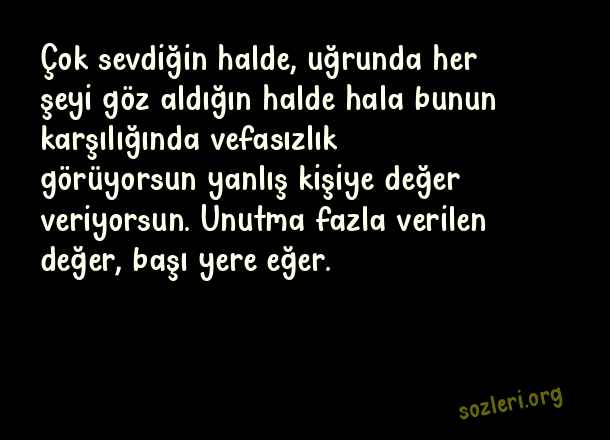 Çok sevdiğin halde, uğrunda her şeyi göz aldığın halde hala bunun karşılığında vefasızlık görüyorsun yanlış kişiye değer veriyorsun. Unutma fazla verilen değer, başı yere eğer. ( Vefasızlara Sözler )