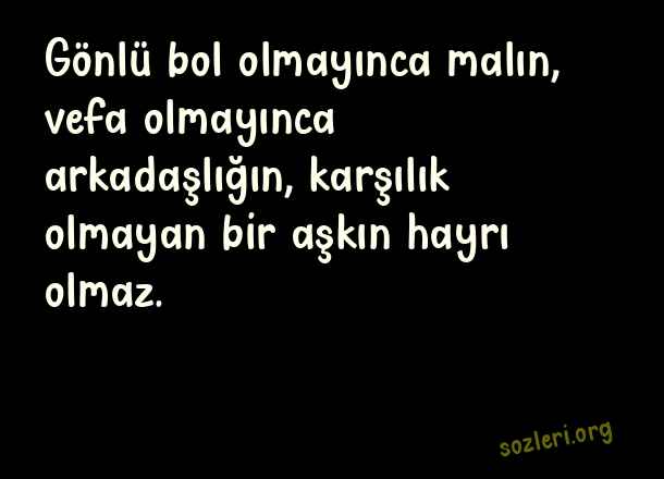 Gönlü bol olmayınca malın, vefa olmayınca arkadaşlığın, karşılık olmayan bir aşkın hayrı olmaz. ( Vefasızlara Sözler )