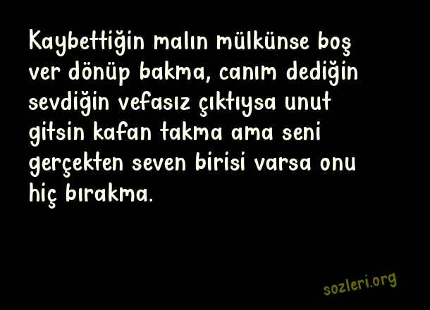 Kaybettiğin malın mülkünse boş ver dönüp bakma, canım dediğin sevdiğin vefasız çıktıysa unut gitsin kafan takma ama seni gerçekten seven birisi varsa onu hiç bırakma. ( Vefasızlara Sözler )