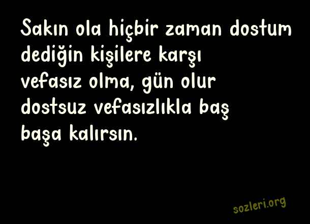 Sakın ola hiçbir zaman dostum dediğin kişilere karşı vefasız olma, gün olur dostsuz vefasızlıkla baş başa kalırsın. ( Vefasızlara Sözler )