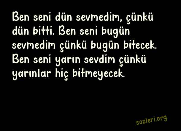 Ben seni dün sevmedim, çünkü dün bitti. Ben seni bugün sevmedim çünkü bugün bitecek. Ben seni yarın sevdim çünkü yarınlar hiç bitmeyecek. ( Whatsapp Aşk )