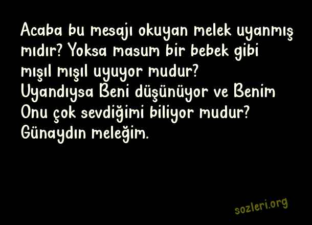 Acaba bu mesajı okuyan melek uyanmış mıdır? Yoksa masum bir bebek gibi mışıl mışıl uyuyor mudur? Uyandıysa Beni düşünüyor ve Benim Onu çok sevdiğimi biliyor mudur? Günaydın meleğim. ( Whatsapp Günaydın )
