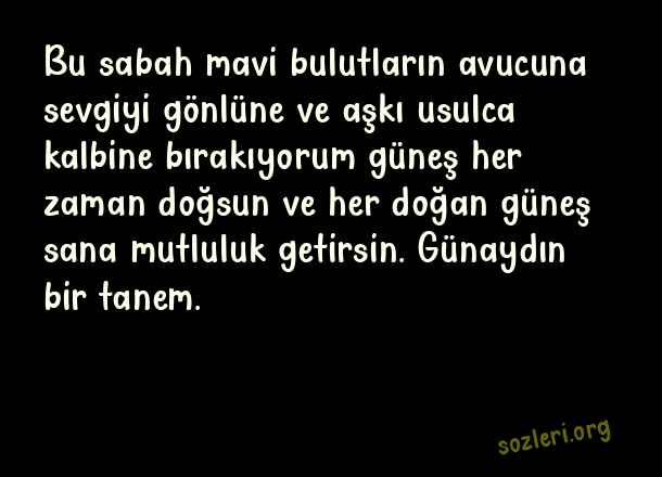 Bu sabah mavi bulutların avucuna sevgiyi gönlüne ve aşkı usulca kalbine bırakıyorum güneş her zaman doğsun ve her doğan güneş sana mutluluk getirsin. Günaydın bir tanem. ( Whatsapp Günaydın )