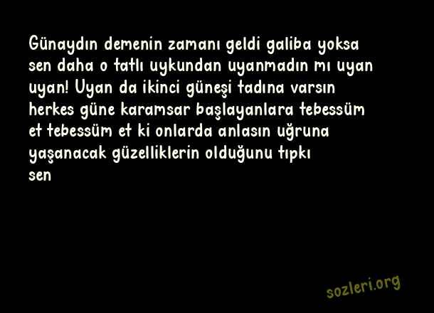 Günaydın demenin zamanı geldi galiba yoksa sen daha o tatlı uykundan uyanmadın mı uyan uyan! Uyan da ikinci güneşi tadına varsın herkes güne karamsar başlayanlara tebessüm et tebessüm et ki onlarda anlasın uğruna yaşanacak güzelliklerin olduğunu tıpkı sen ( Whatsapp Günaydın )